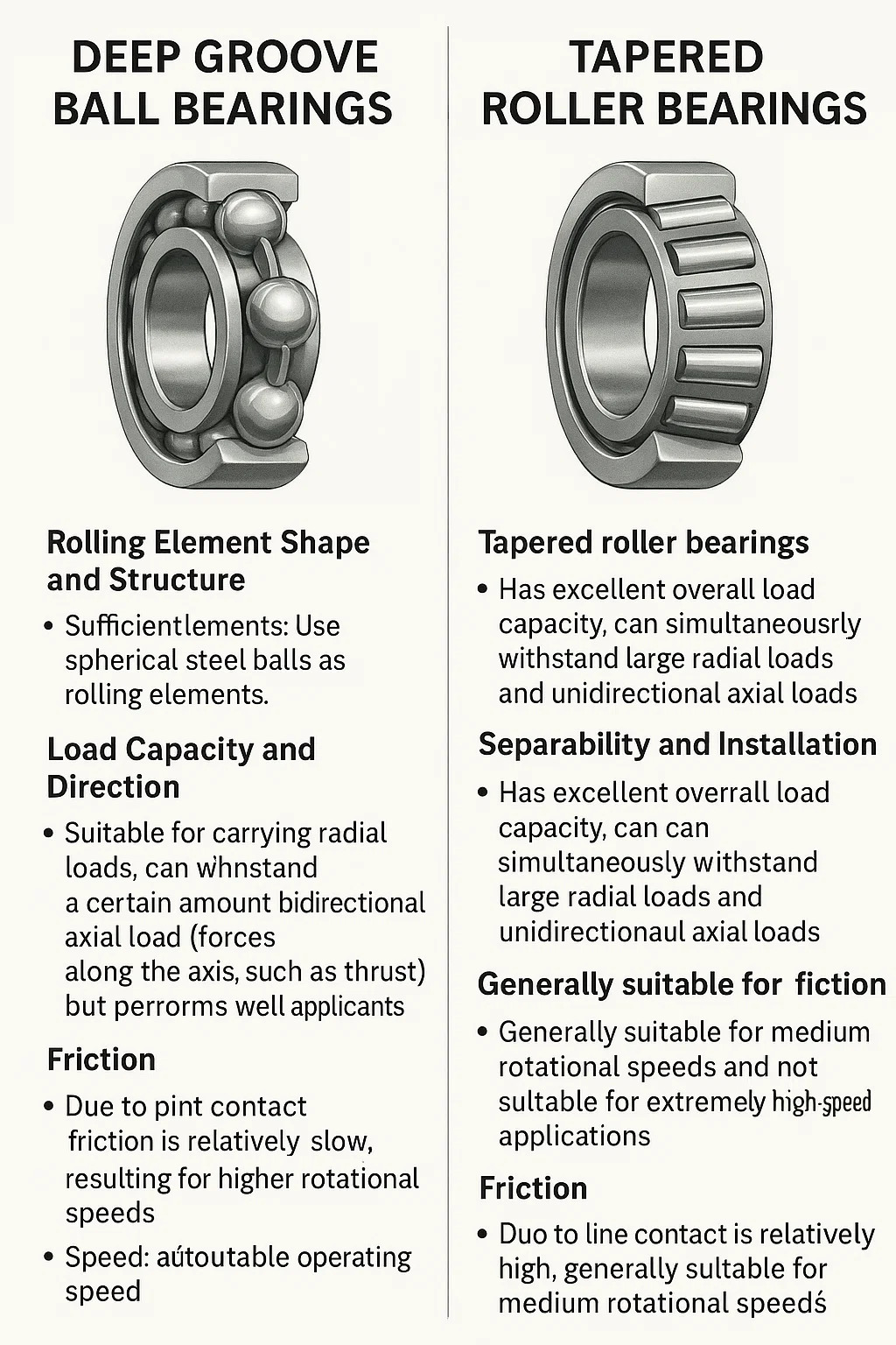 Guľkové ložiská s hlbokými drážkami a kuželíkové ložiská sú dva veľmi bežné typy ložísk a majú výrazné rozdiely v štruktúre a použití.